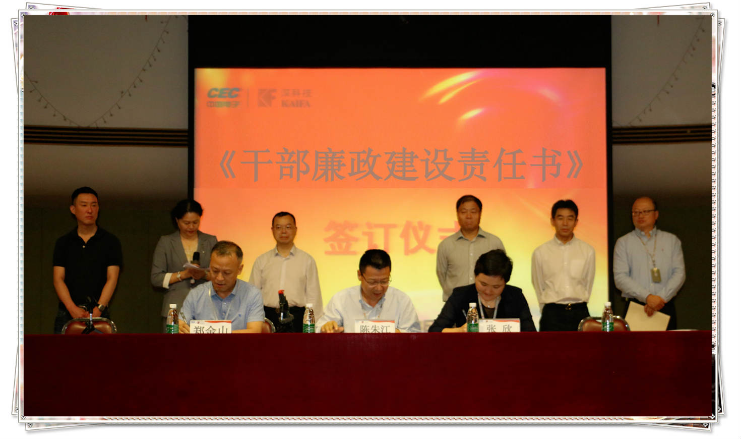 (↓ 公司黨委書記、副總裁陳朱江與地產開發部負責人鄭金山、采購部負責人張欣簽署干部廉政建設責任書)